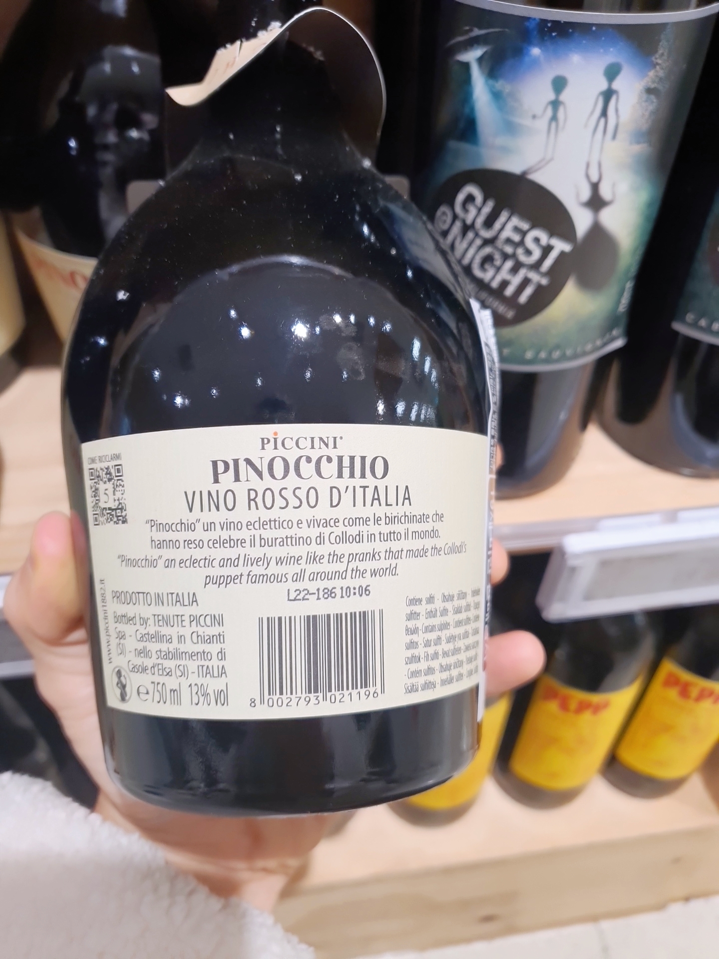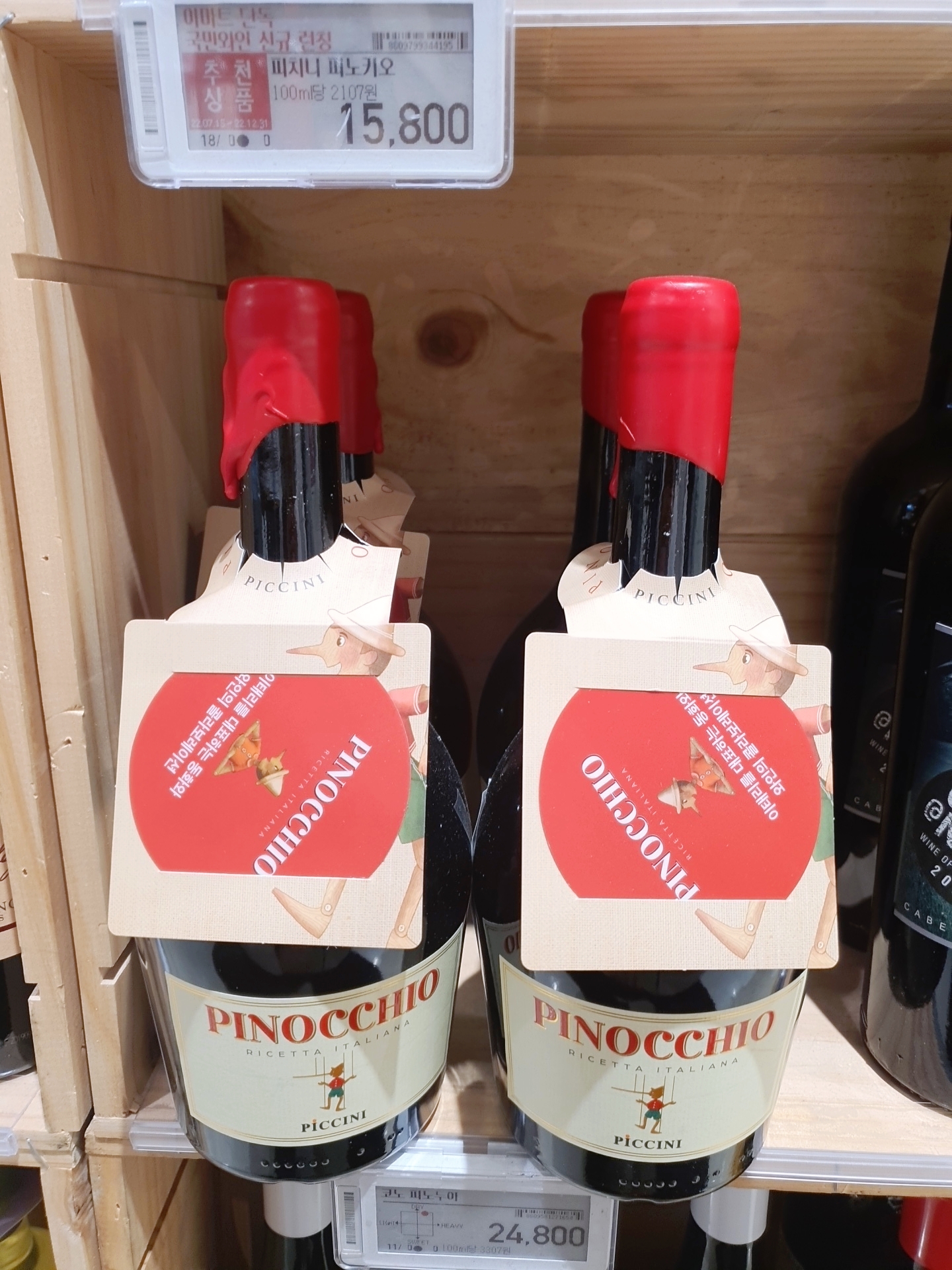 병 모양 자체도 특이하게 생겼고 입구마개에 빨간 파라핀 코팅까지 되어있어 스토리텔링과 디자인만으로는 매우 합격으로 생각되는 피노키오. 한 번 쯤 마셔보고 싶다 생각했는데 이번기회에 구매해봤다. 이마트 단독 런칭이라고 하는데 할인은 전혀 안 하는듯 하다. 그런데 와인 등급도 품종도 안 쓰여있어서 인터넷에서 품종만 겨우 찾았다. 이렇게 되면 맛에 대한 품질이 일정하게 관리 될수 있는게 맞나 싶긴하다.