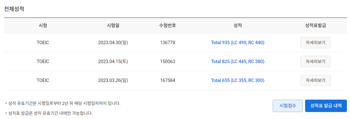3일 공부한 첫시험은 655점 이었고 20일 정도 후 치른 시험 825점 이었으며 취소하지 않고 추가로 본 15일 이후의 시험은 935점 이었다.