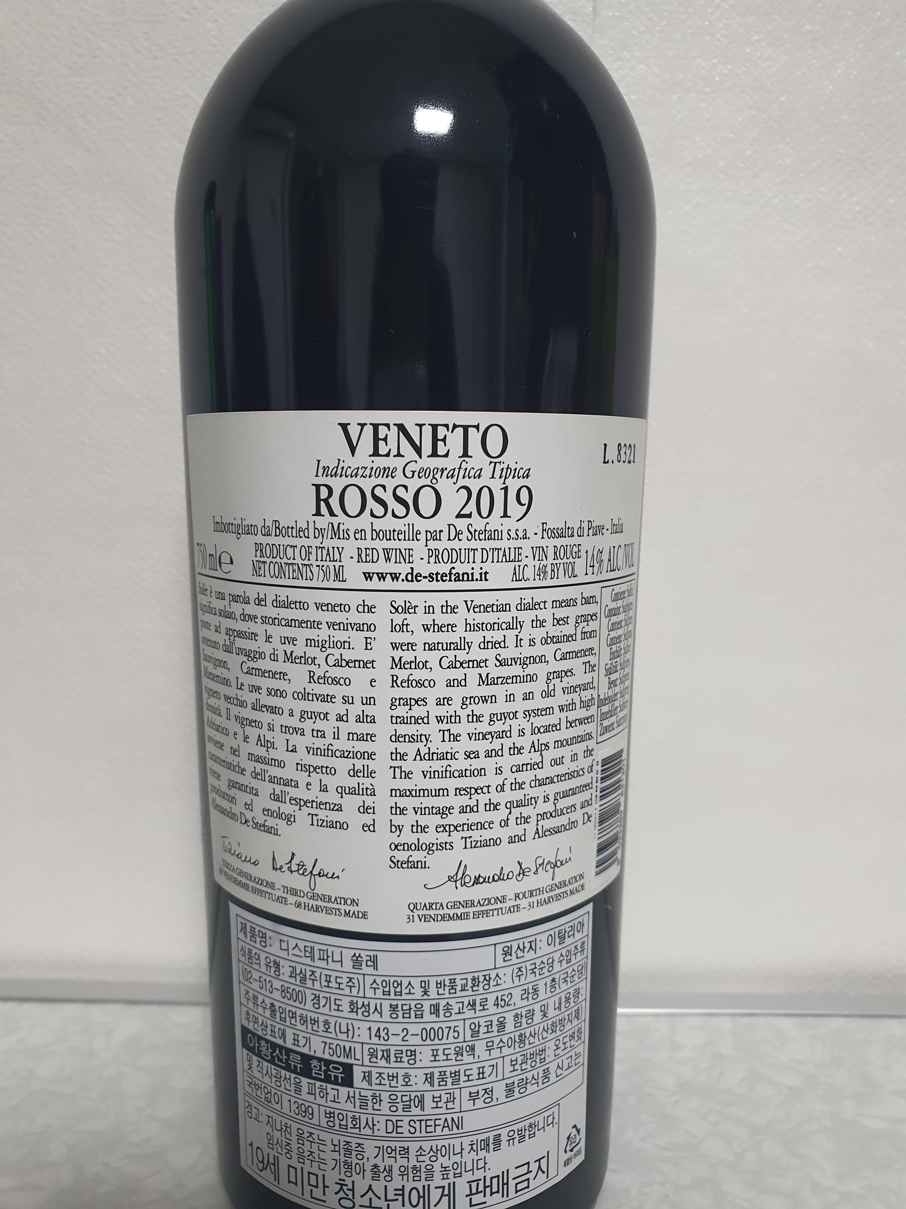(번역) 베네치아 방언으로 Solèr는 헛간, 다락방을 의미하며 역사적으로 최고의 포도가 자연 건조되었던 곳입니다. Merlot, Carbernet Sauvignon, Carmenere, Refosco 및 Marzemino 포도로 빚어냅니다. 포도는 고밀도의 guyot 시스템으로 훈련된 오래된 포도원에서 재배됩니다. 포도원은 아드리아 해와 알프스 산맥 사이에 위치해 있습니다. 양조는 빈티지의 특성을 최대한 살려 수행되며 품질은 생산자와 양조학자인 Tiziano와 Alessandro De stefani에 의해 보장됩니다.