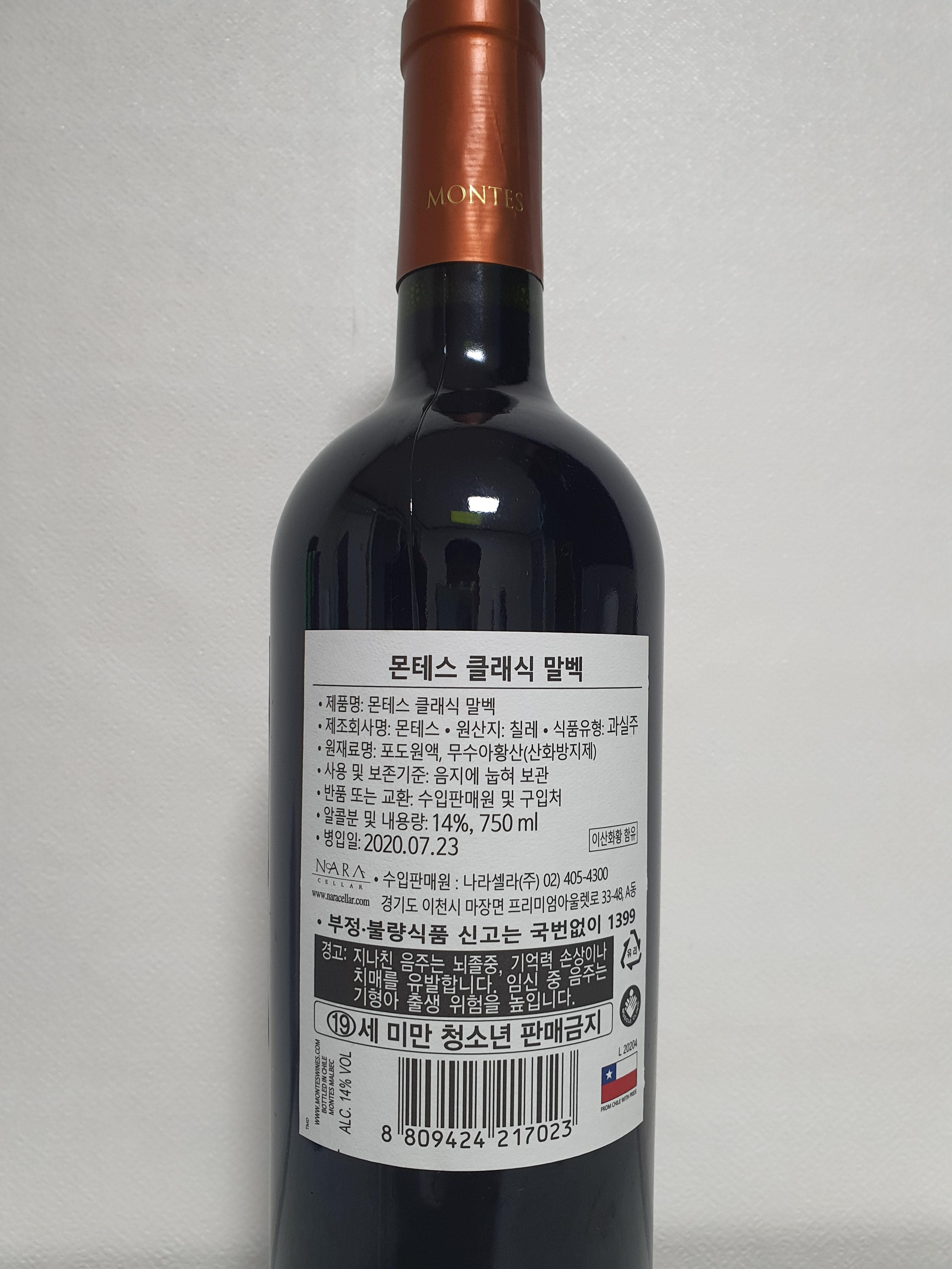 오늘은 그냥 실패하지 않는 무난한 브랜드 와인중에 heavy dry 한걸 골라보다가 이마트에서 구매했다. 결과는 성공적. 평소 몬테스 15000원 하는데 다른 몬테스 들도 13000원 쯤 하길래 몬테스로 골랐다! 근데 왜 병 뒤 한글이랑 판매대 라벨은 '클래식' 이라고 쓰여있는데 앞 라벨에는 클래식이라는 단어가 안보이지...? 홈페이지를 뒤져봐도 클래식 시리즈 말벡은 확실히 쓰여있는데 왜 이건 reserva만 쓰여있는지 모르겠다. 수입처 측의 실수인가..?